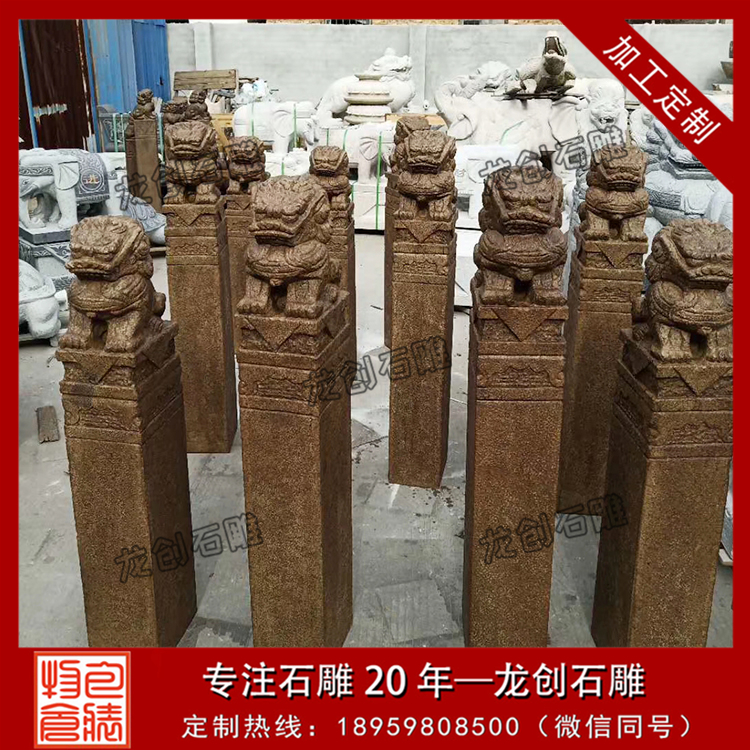 石雕拴馬樁樣式齊全、規(guī)格不一,常見的石雕拴馬樁都是方20cm的柱子,高度在1.5-2.0米之間,其最主要的不同便體現(xiàn)在它最上面的柱頭上。石雕拴馬樁的柱頭雕刻樣式很多,有雕刻獅子的、雕刻麒麟的還有雕刻