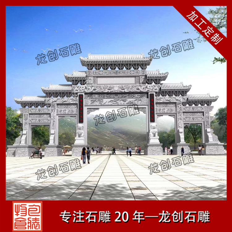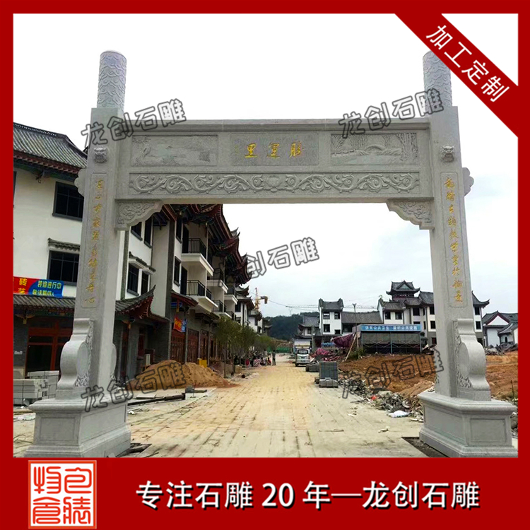 三門農村石牌樓:從目前的石牌樓的設計款式來看,三門農村村口農村石牌樓經常安裝在農村的出入口處。鄉村牌坊的設計是經過歷史發展而沉淀下來的。它廣泛用于農村建設和旅游區及寺院等處。它在使用中中很受大眾們的歡迎。三門農村石牌樓造型精美、設計對稱,整體設計以及設計款式及造型也有許多新的改進和更新。它選擇了更加多樣的精美雕塑圖案,這樣會更加打造精美的牌坊作品。普通三門農村石牌樓價格在12-25萬元左右。雕刻很精細的石牌樓,價格可能幾十萬。