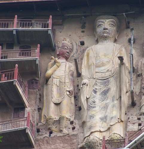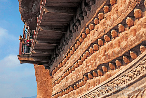這里的泥塑大致可以分為突出墻面的高浮塑,完全離開墻面的圓塑,粘貼在墻面上的模制影塑和壁塑四類。其中數以千計的與真人大小相仿的圓塑,極富生活情趣,被視為珍品。石窟建自公元384年,后來經過十多個朝代的不斷開鑿、重修,遂成為中國著名的大型石窟之一。