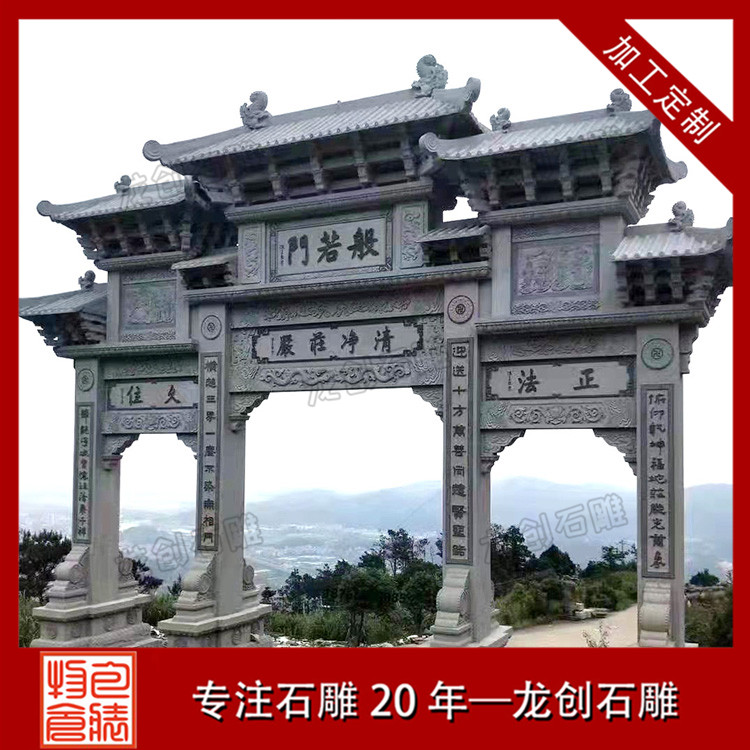 石雕山門作為寺廟的重要入口,其設計和制作都非常講究。首先,山門的造型要與寺廟的整體建筑風格相協調,既要體現出寺廟的莊嚴肅穆,又要彰顯出寺廟的獨特韻味。其次,石雕山門的雕刻工藝要求非常高,既要表現出線條的流暢美感,又要彰顯出雕刻技法的高超。最后,石雕山門的顏色也是非常重要的,通常選用深色系的石材,以突顯出寺廟的神秘色彩。