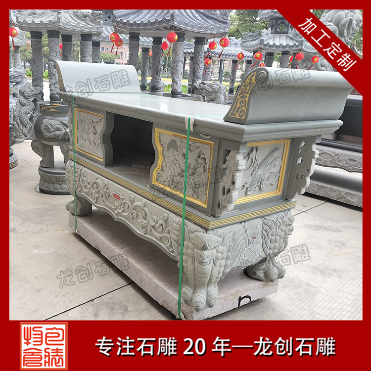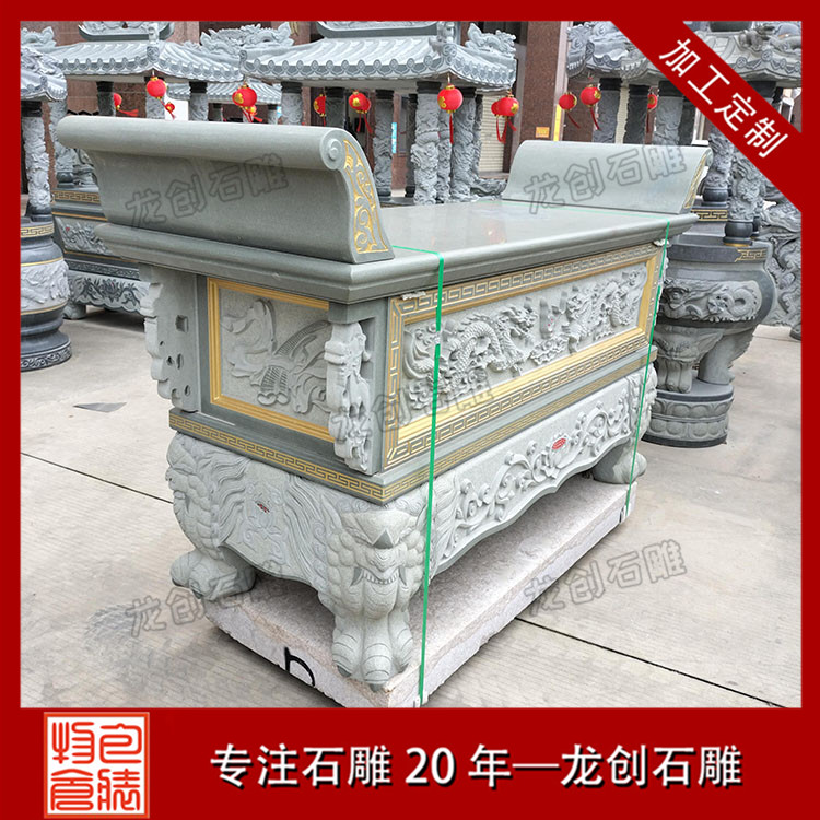 青石:青石以其古樸典雅的青灰色調深受喜愛。它的質地相對細膩,易于雕刻,能展現出精致的圖案和紋理。在雕刻傳統中式風格的石雕供桌時,青石是一種理想的材料,能很好地體現出中國傳統文化的韻味。