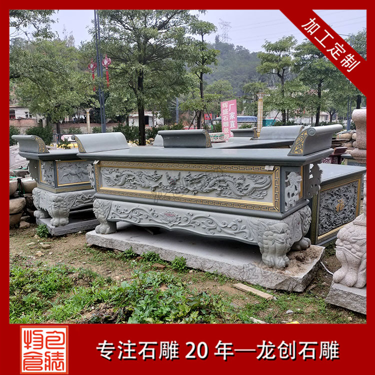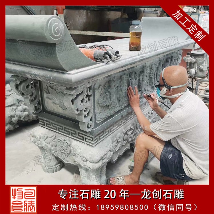 手工與機械結合:在現代石雕供桌的制作過程中,通常是手工與機械相結合的方式。機械加工可以完成一些基礎的切割、打磨等工作,提高生產效率。而關鍵的雕刻環節則依賴于經驗豐富的工匠手工完成,他們憑借精湛的技藝和對傳統文化的理解,將靈魂注入到每一個雕刻細節中,確保供桌的藝術品質。