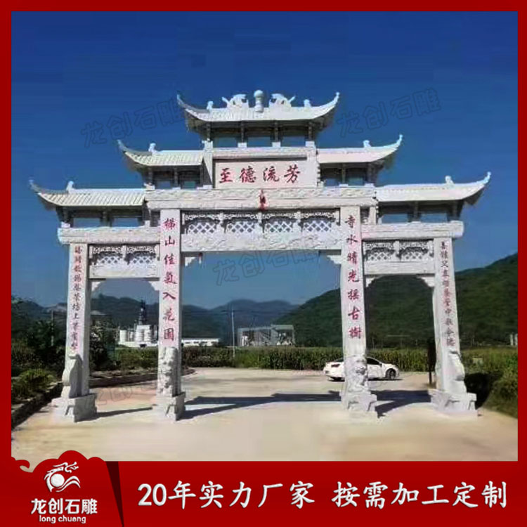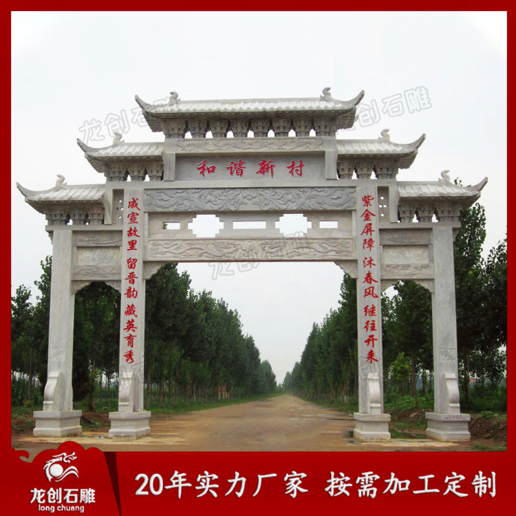 三門石雕牌坊在農村地區也是比較常見的,三門五樓牌坊定制也比較多,尤其是現代一些新農村建設中更是經??梢钥吹竭@類三門石牌坊設計的農村石牌坊。農村地區的牌坊通常起到了標志地名以及裝飾性作用,在實際雕刻的時候應當要考慮到農村地區的特色以及風土人情等情況,從而能夠雕刻出更為精致的石雕牌坊作品,展現牌坊的建筑之美。