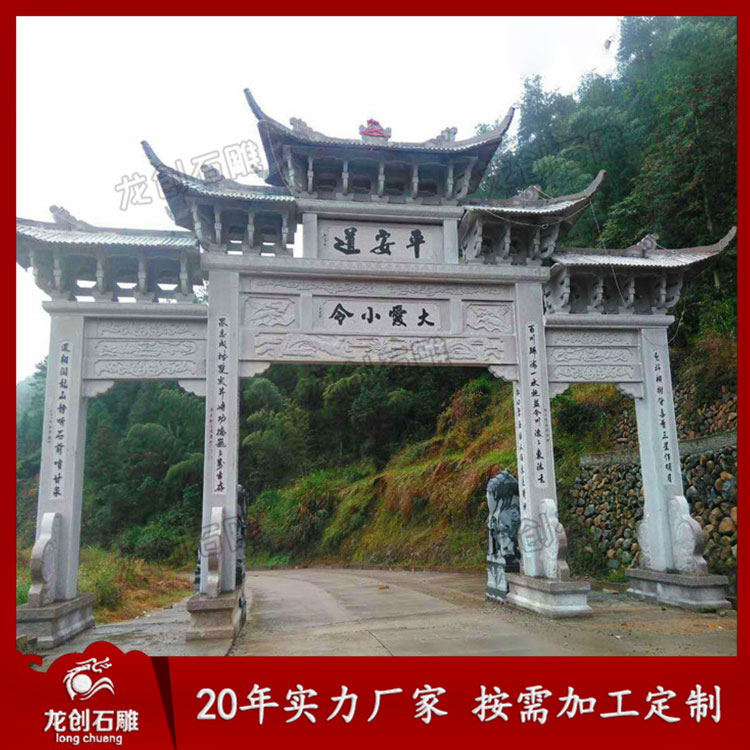 村口牌坊牌樓作為提升農(nóng)村形象的重要建筑物,在選擇上要綜合考慮,農(nóng)村修建村口門(mén)樓一般以簡(jiǎn)單大方為主,而村口門(mén)樓分為有樓的和沒(méi)樓的兩種樣式,門(mén)數(shù)又分為一門(mén)石牌樓、三門(mén)石牌樓、五門(mén)石牌樓等。村口門(mén)樓一般一門(mén)一樓三樓或三門(mén)三樓五樓七樓較為常見(jiàn),五門(mén)的很少見(jiàn)。石牌樓常見(jiàn)的這幾種樣式也是農(nóng)村人都非常喜歡的,原因一簡(jiǎn)單大方,原因二價(jià)格實(shí)惠,這兩點(diǎn)很重要。