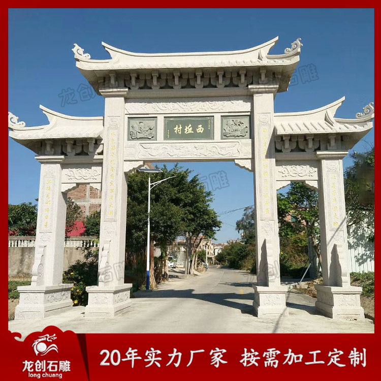 村口牌坊牌樓石雕的興起是一種盛世的象征。村口石牌樓體現(xiàn)了農(nóng)村經(jīng)濟(jì)繁榮、設(shè)施完善、環(huán)境優(yōu)美、文明和諧的社會(huì)主義新農(nóng)村的核心價(jià)值,這也是社會(huì)主義新農(nóng)村建設(shè)的成功見(jiàn)證之一。