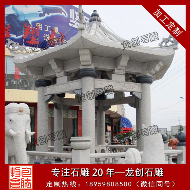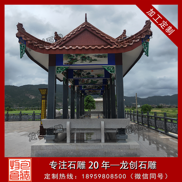 石雕涼亭走廊是供人休息的場所,可利用的石材有大理石、花崗巖、青石等等,不同材質造價不一樣,尺寸也是影響涼亭石雕價格的因素,具體報價歡迎咨詢——石雕涼亭走廊廠家龍創石雕。