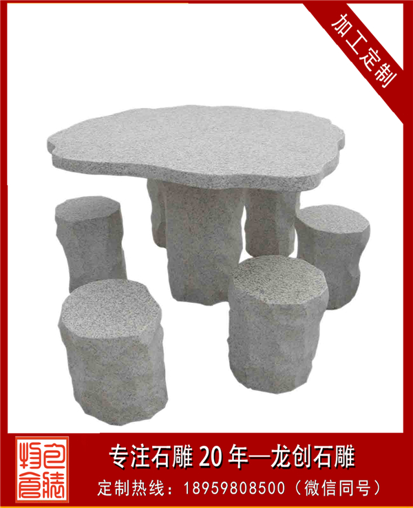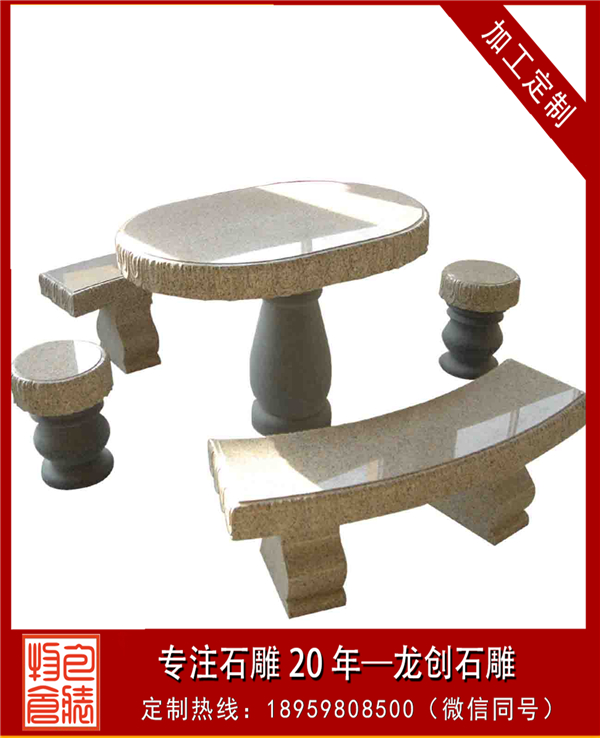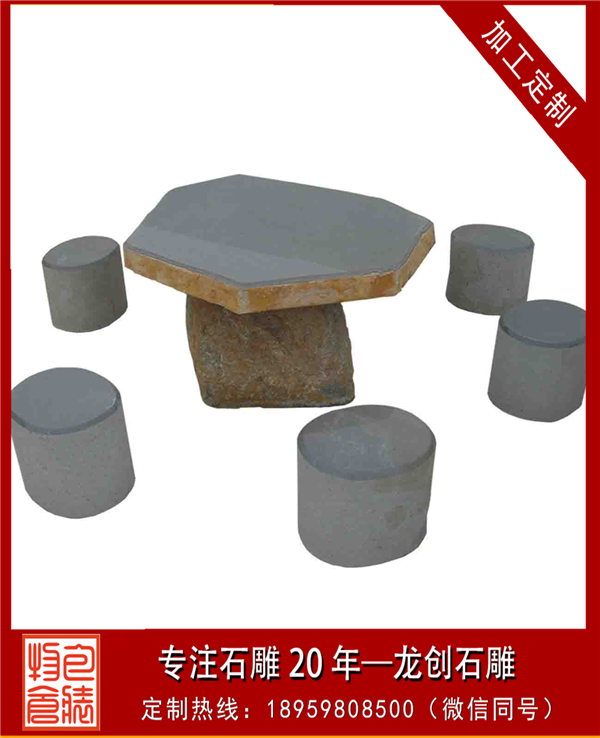 利用石材的石桌椅雖然堅硬,但是可塑性強,不易損壞,可制作造型多樣的石桌椅。最為簡單的石桌椅有由簡單修飾的圓柱坐凳與圓板組成的一組石桌椅,還有用幾塊石板組成的石靠背椅、長椅或者單椅等。還可以做進一步雕塑,可江坐凳打磨成葫蘆形或者雕塑各種花紋,還可將坐凳雕塑成動物坐凳、手坐凳等其他藝術造型??勘骋芜€可仿沙發形狀來進行雕塑,可長方形也可做成弧形。長椅不單可做直線,也可做曲線,整石打磨或者把兩側做成動物造型。而單椅能雕刻成各種各樣動物造型,還能根據需要來選擇大小。